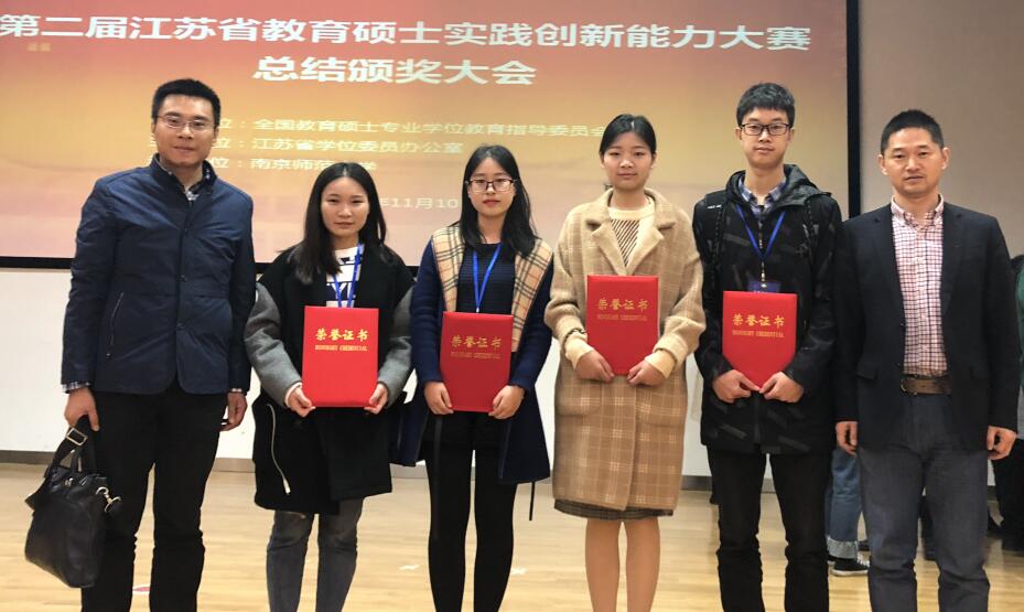 On November 10th,2018, the 2nd Jiangsu Master of Education Practice Innovation Capability Competition was completed. A total of five contestants from our school went to Nanjing to participate in the competition. After fierce competition, Chen Xinxin, major in Chinese teaching, won the second prize of the competition, Zhou Yuhang(major in mathematics teaching), and Zhu Chaoying (major in education) won the third prize.