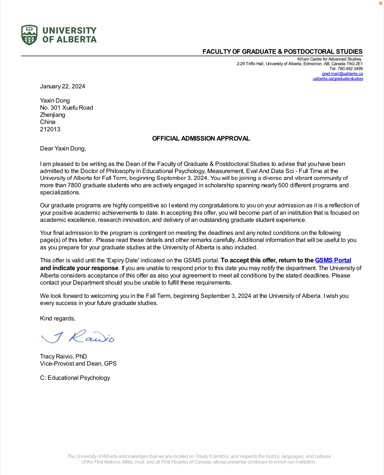 黄金岩教授2021级教育测评与研究方法方向硕士研究生董雅鑫被加拿大阿尔伯塔大学(University of Alberta)录取为博士研究生,研究方向为“教育心理学、测量、评估与数据科学”,该方向在北美享有极高声誉,申请难度大。