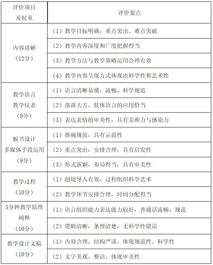 考察选手六个方面的能力,分别是:(1)对教学目标、重点和难点的把握能力;(2)对现代教学理念、教学方法和教学策略的运用能力;(3)教学环节和教学过程的科学性;(4)教学语言表达的科学性、规范性和教学体态的得体性;(5)板书设计或多媒体手段的合理性;(6)整体考察选手对教材知识体系和多维目标的领悟能力,以及对教学原理的运用能力。
