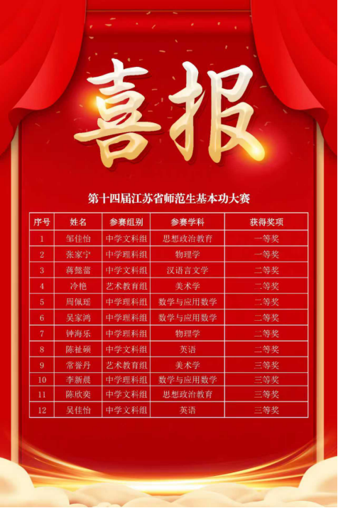近日,第十四届江苏省师范生教学基本功大赛发布比赛结果,我校学生邹佳怡、张家宁荣获一等奖,蒋懿蕾等六名同学荣获二等奖。